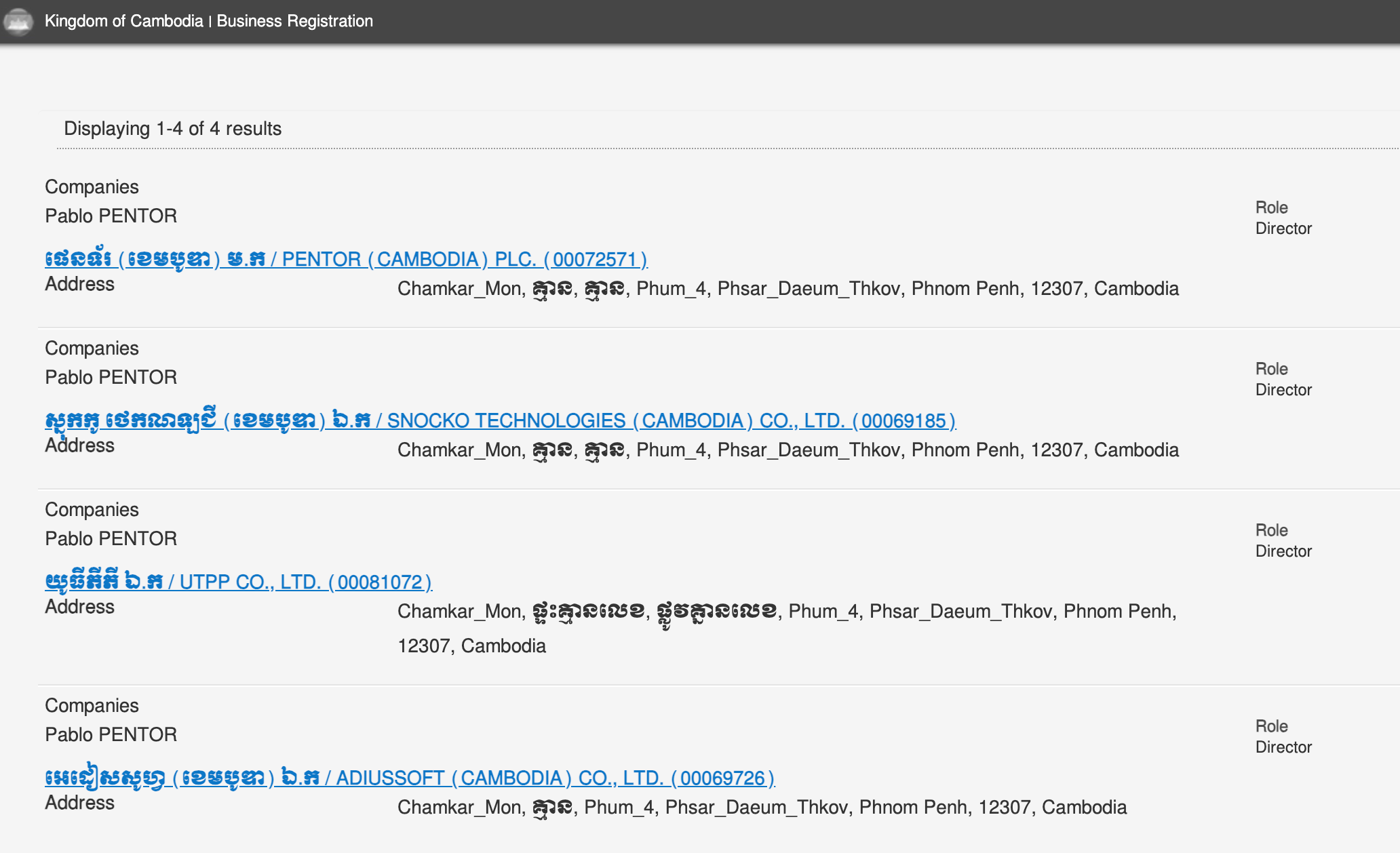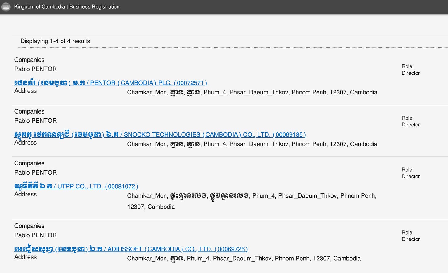 By August 2023, the new business Snocko Technologies — a “computer programming company” — was registered in Cambodia, under none other than Pablo Pentor and Erwin Richford. About six weeks had passed since they were naturalized.
