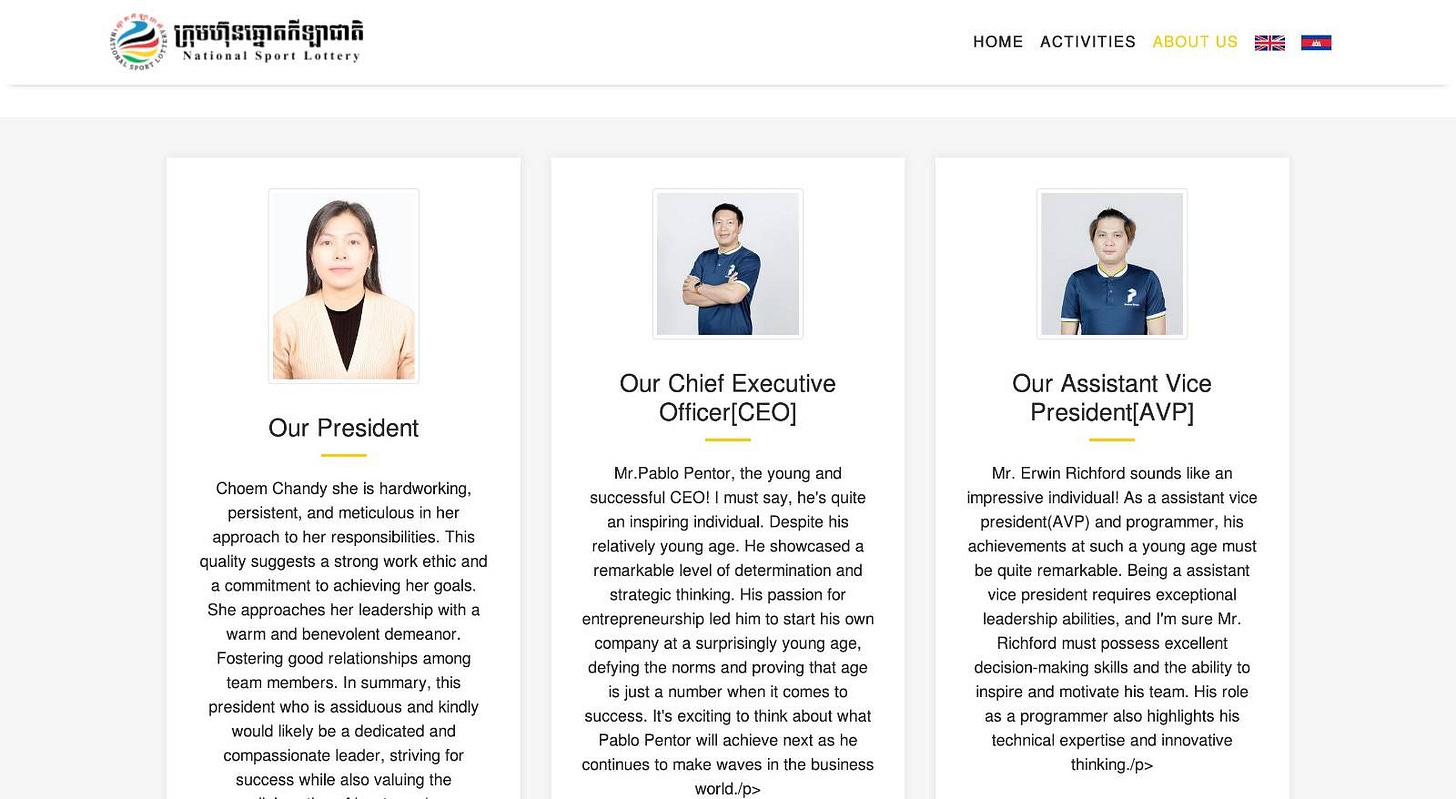 Aside from the name change, Pentor is living an entirely public life in Cambodia. Here’s a photo of him and Richford advertising another business, the National Sport Lottery, which offers a variety of lottery products and claims that “being the biggest lottery seller company in the country must be quite an achievement.” Indeed!